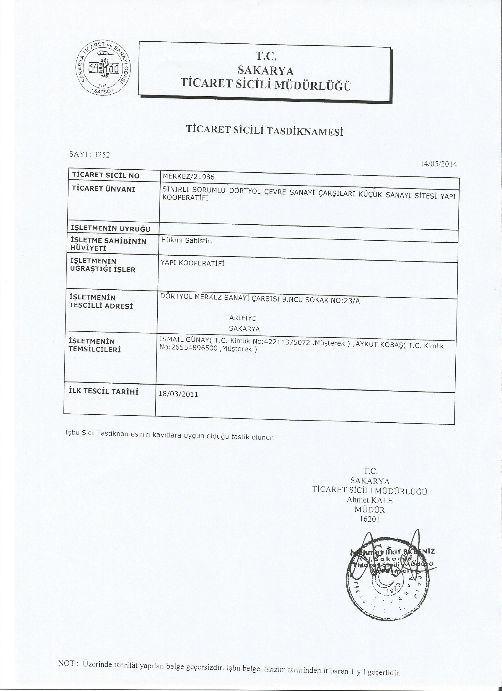 | Ticaret Sicili Tasdiknamesi | 25-11-2019 |